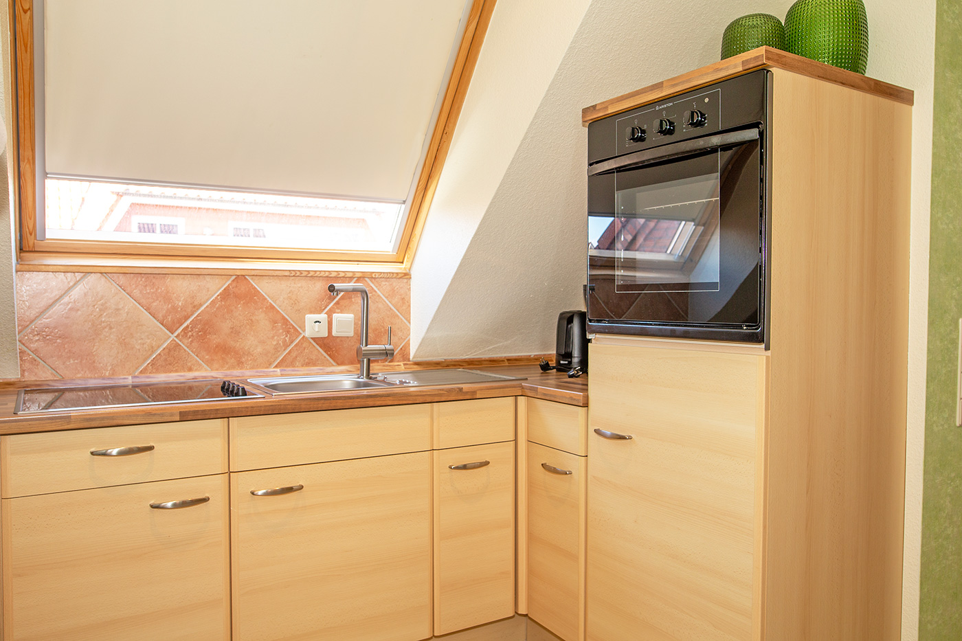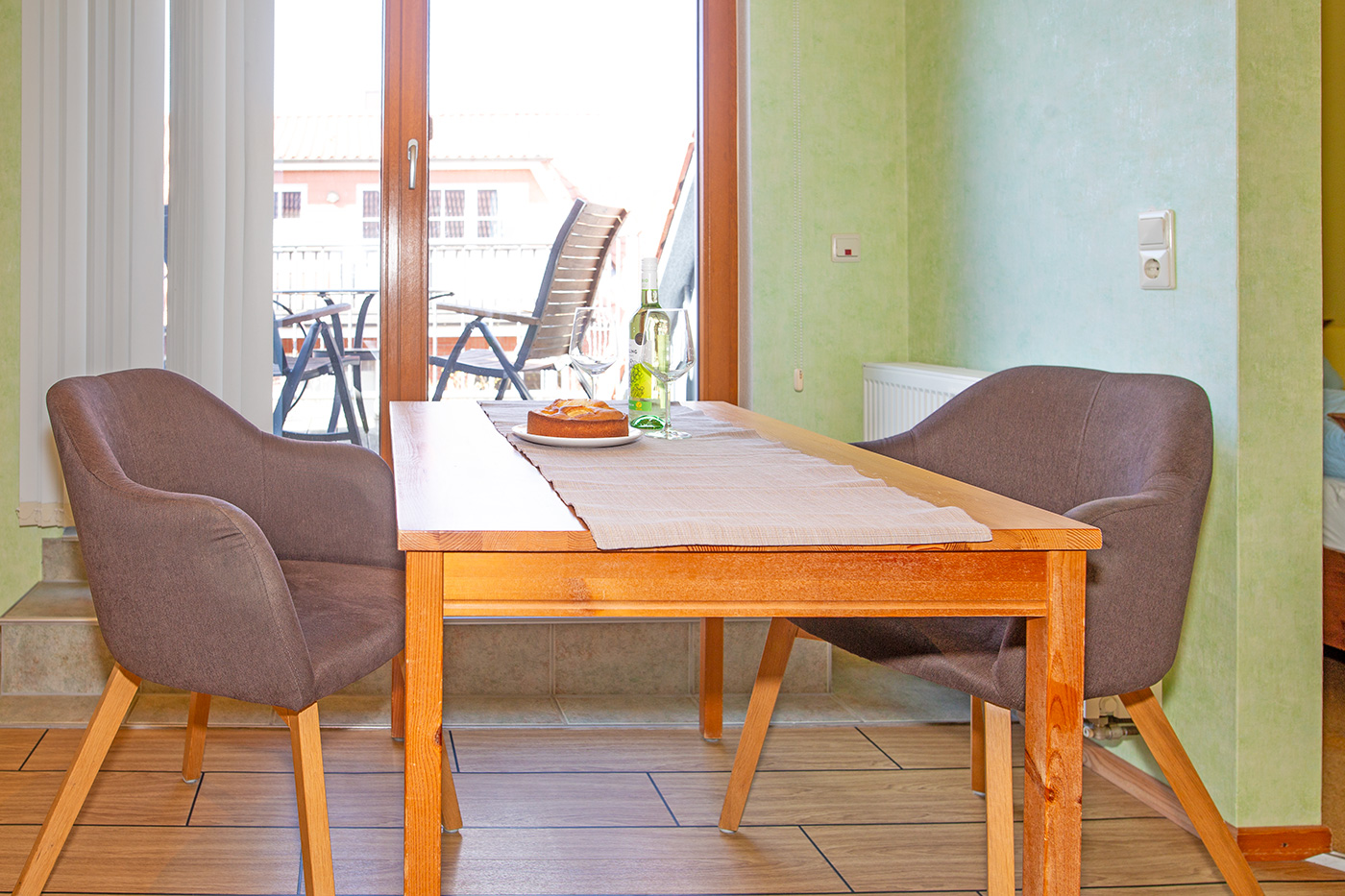 Das Apartment für Zwei! In der ersten Etage liegt die zweite, mit ~40m² etwas kleinere Ferienwohnung. Es handelt sich um ein gemütliches Einraum-Apartment mit Küchenzeile und eigenem Balkon.