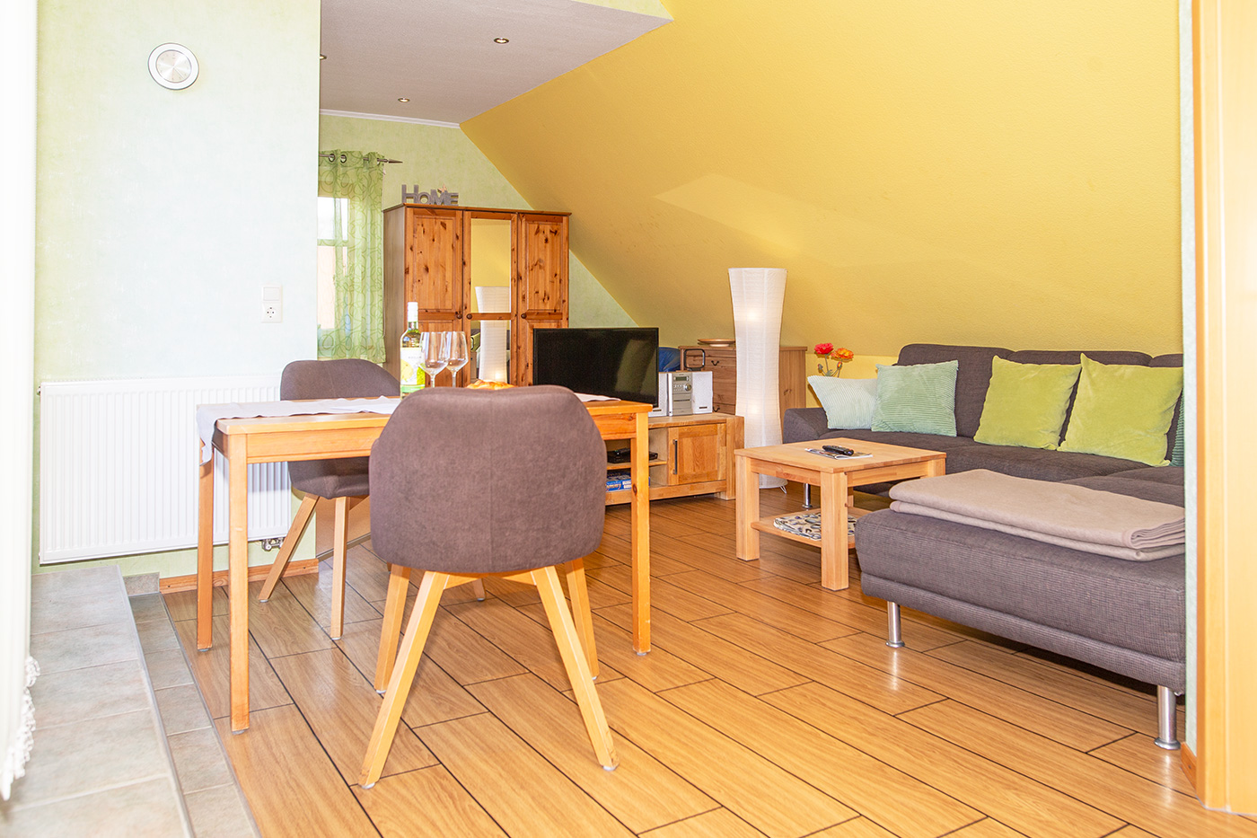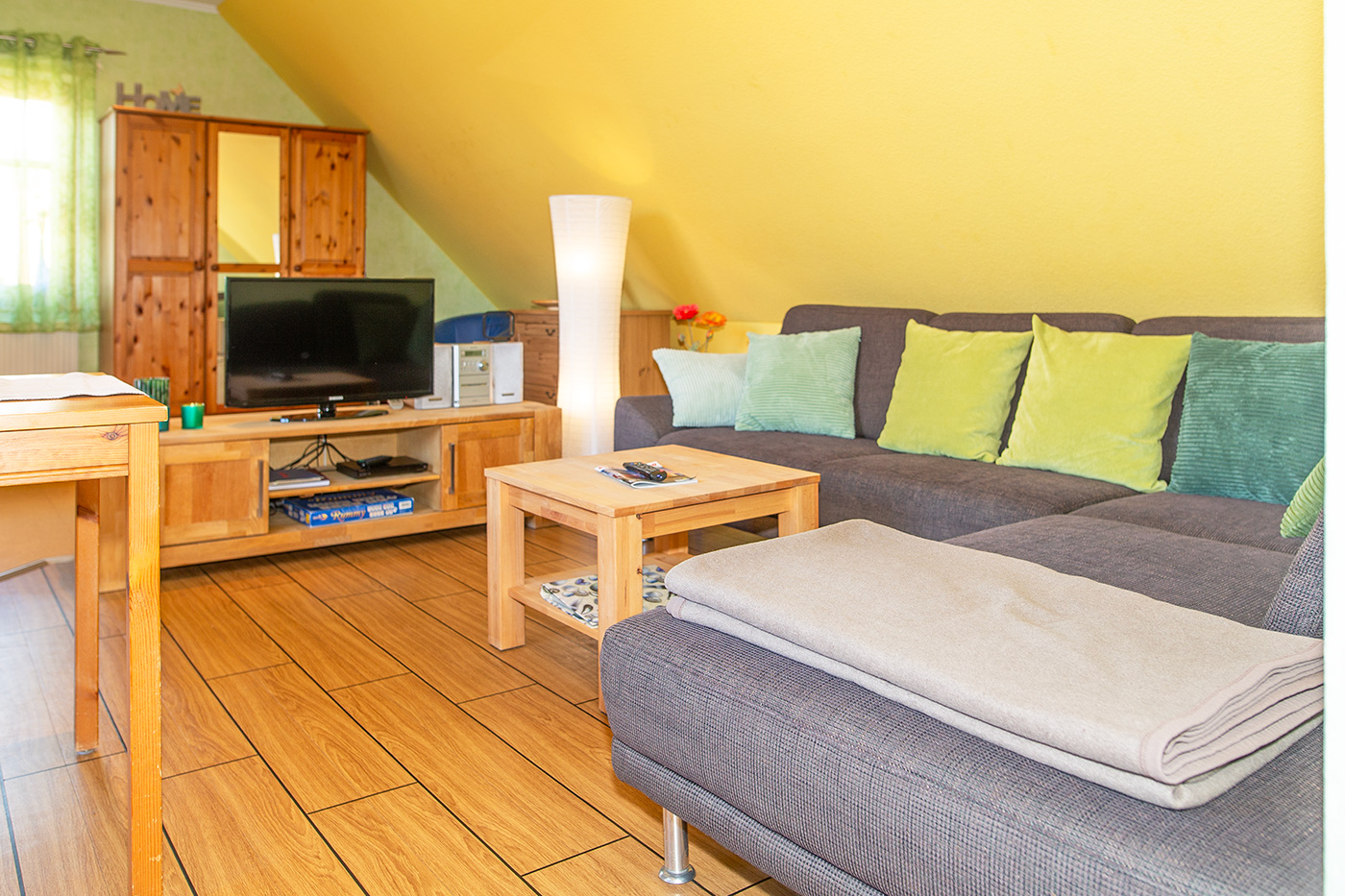 Die ~60m² große Ferienwohnung 1 liegt im Erdgeschoss und bietet Platz für bis zu vier Personen. Sie besteht aus einem großzügigen Wohnbereich mit integrierter Küchenzeile, zwei Schlafzimmern, einem Badezimmer mit Dusche und WC sowie einem eigenen kleinen Garten direkt vor dem Wohnzimmer. Die geschmackvolle Einrichtung sollte es Ihnen an nichts fehlen lassen, damit Sie sich voll und ganz auf Ihren Urlaub konzentrieren können. Die Küche ist mit allem ausgestattet, um Ihnen die häusliche Selbstverpflegung problemlos zu ermöglichen. Im Wohnraum befinden sich ein Kabelfernseher mit einem DVD-Player. Ein zweiter Fernseher befindet sich im Kinderschlafzimmer. Und auf der Terrasse steht der Grill schon bereit.